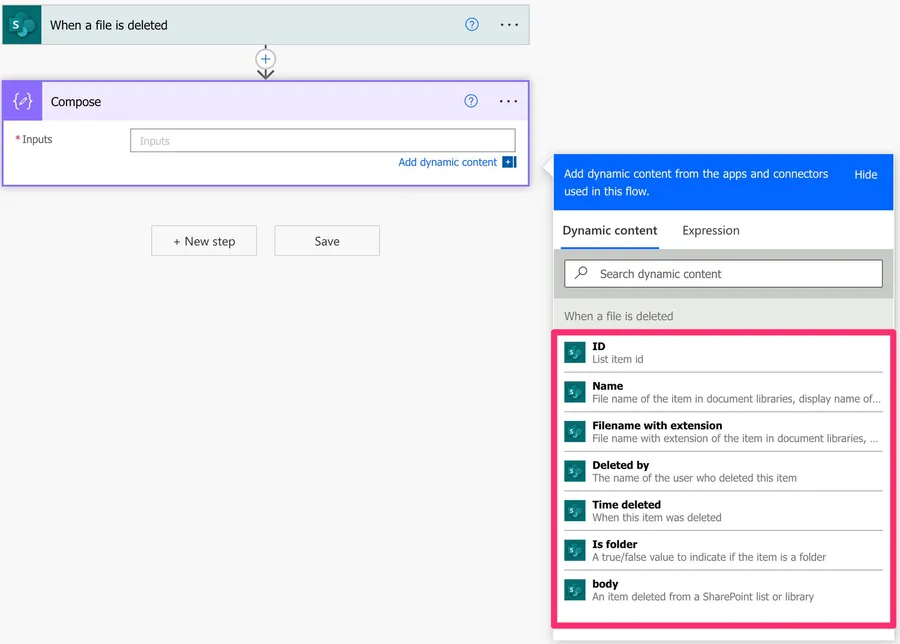 It’s important to understand that this trigger won’t return the deleted file and its characteristics. It will return only a subset of information mentioned in the previous section. It’s non-intuitive since other actions like the “When a file is created or modified (properties only) Trigger” for example, return all file information since it still exists and can be accessible. SharePoint can’t return the information since the file was deleted. Think of it as a last warning after the file is deleted, not before.