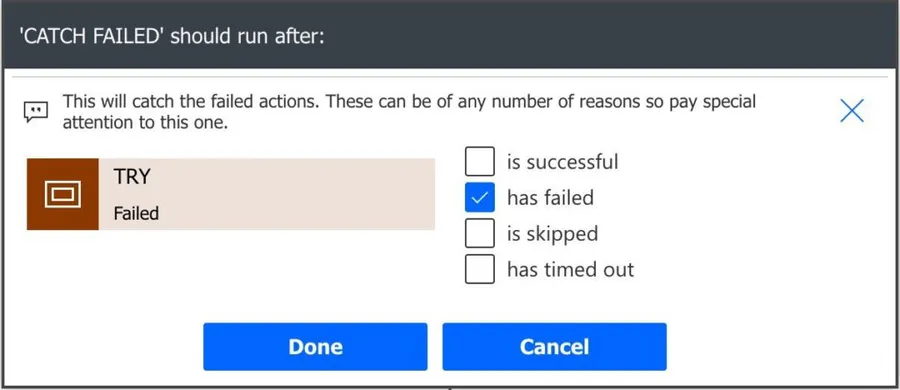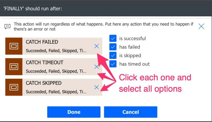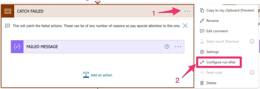This is where all the “magic” happens if something goes wrong. To achieve this, we need to configure the “Configure run after” for each of them to catch individual errors. For example, in the “Failed,” we do: