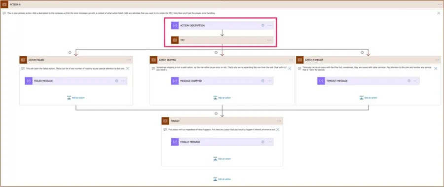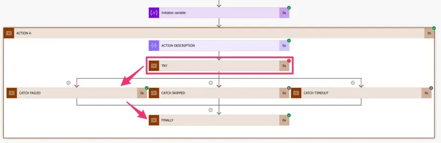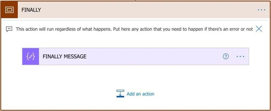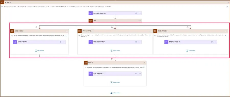 With this, you can add a new group of actions in your Flow and control if they fail or not. All logic will be inside the Scope action, so you can add multiple sequential “blocks” of “try, catch, finally” and control how your Flow will act in each “section.”
