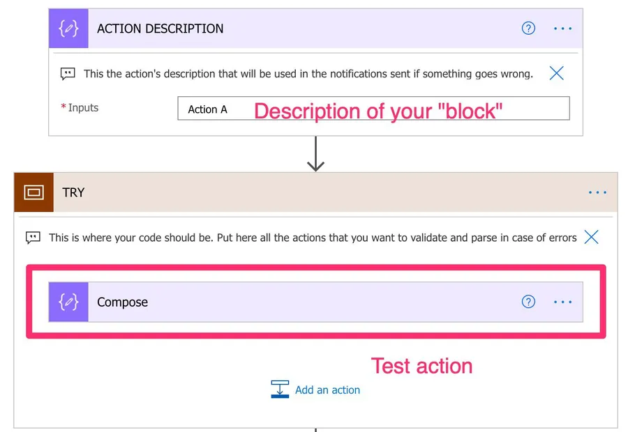 The compose will contain the description of the “try, catch, finally” block. This will be used in the error messages so that you can have, for example, “Build Email: Failed.”