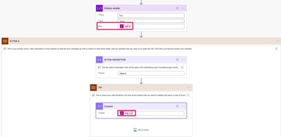 Let’s do a simple test. We’ll define a variable with a “null” value and then try to convert that number into an int in the “try” part. We would get a failure that our Flow will “catch” in the first branch of the tree.