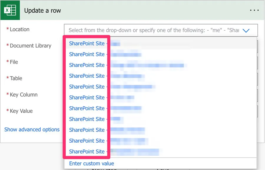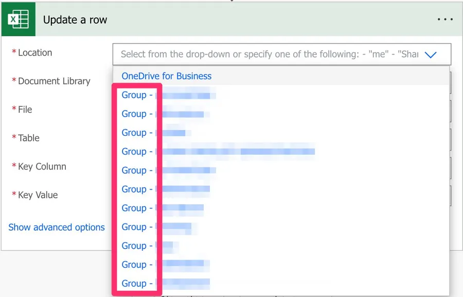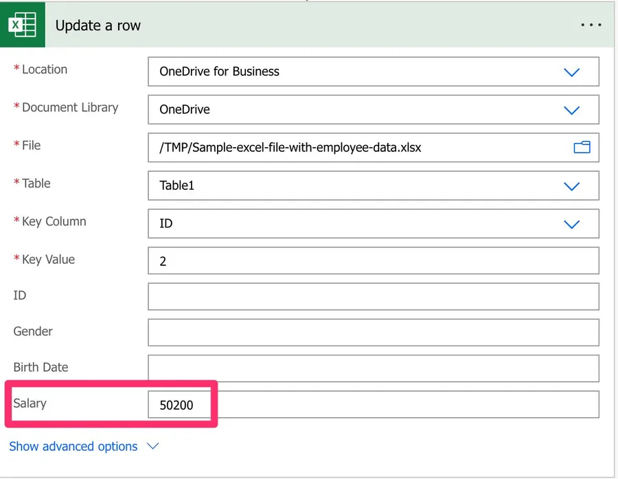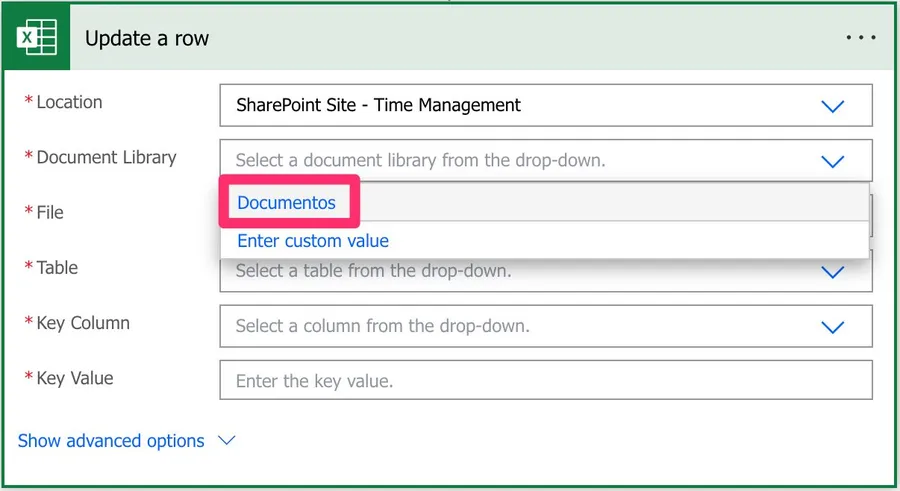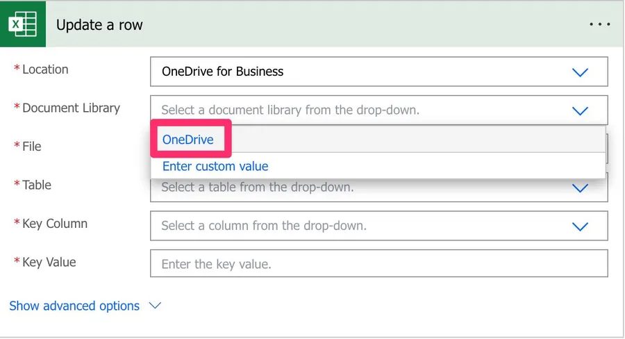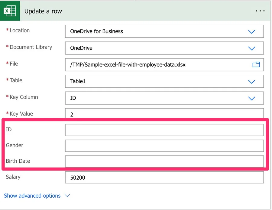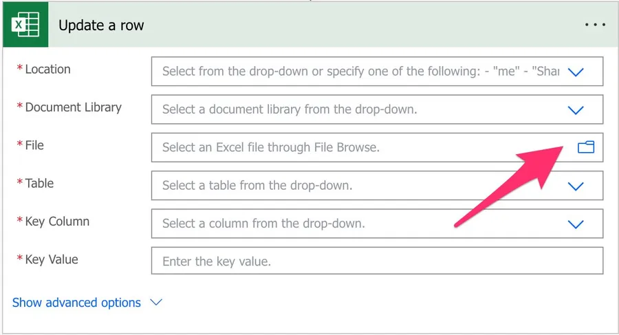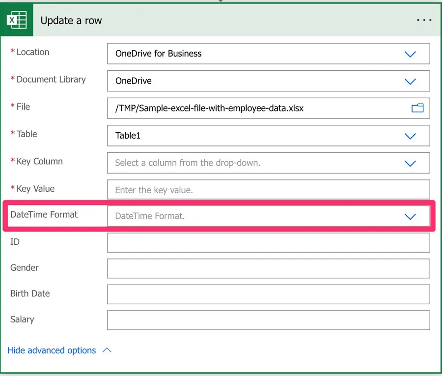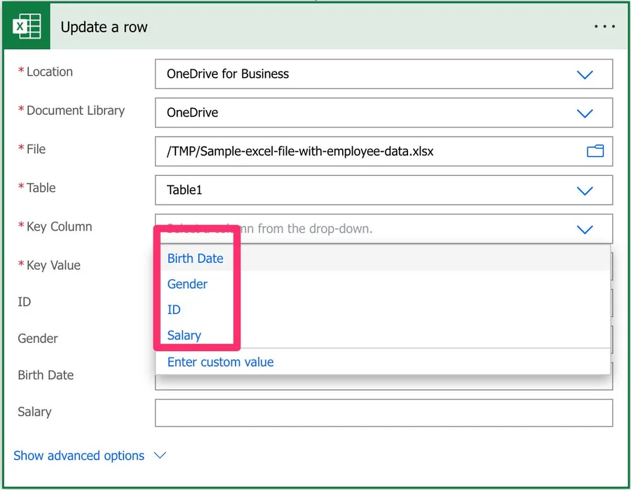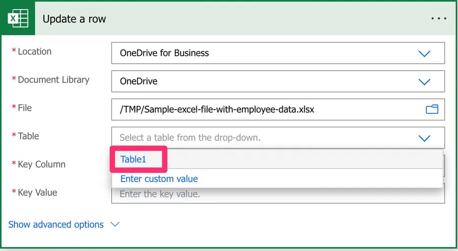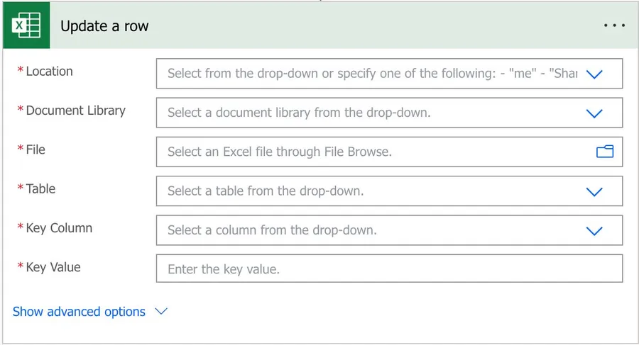 Please be aware that if you dynamically define the path, table, or file, you need to provide the “key column” name since Power Automate won’t find the list of columns before the Flow runs.