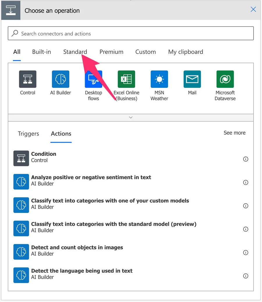 Power Automate tends to save the most common actions in the main screen, so check there before going through the full hierarchy. Also, you can use the search to find it quickly. [/su_panel]