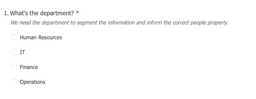 - Ensure that the department is always filled in the same way. Some people could write “HR,” “Human Resources,” or “HR Department.” People are creative, and this way, the information is always the same.