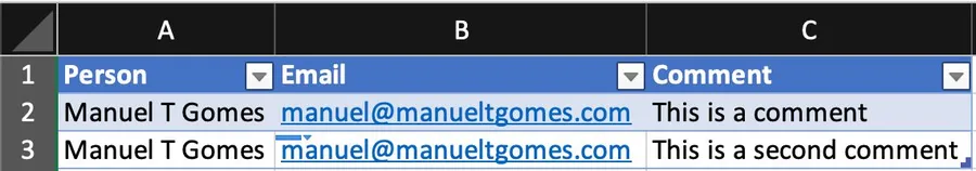 In the example above, we have a list of two comments I made. If I want to get the second row, I need a way to tell Power Automate that I wish to the row with the comment “this is a second comment”. Of course, we could use the row system in Excel, but what if we move the table a few rows down? Or if we add a new row in the middle? Or sort the data by “Comment,” for example. In one case, it would be row “2” but in others could be row “1”. We would not have a way to identify the data we want to collect since the rows keep changing for the same data, so here’s where the key column comes into place.