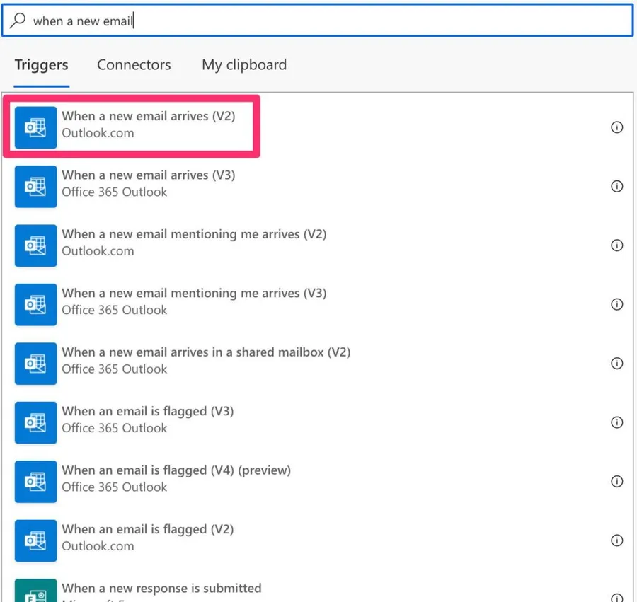 There are two versions of this trigger—one for Office 365 and another for Outlook.com. Please use “Office 365,” although the other one works similarly.