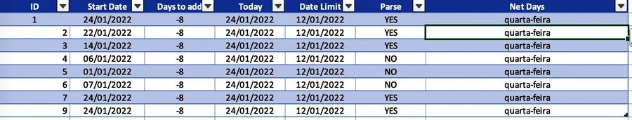 I explore this more in this example in this article, so let's look at the question that triggered this article. The idea was to fetch information from 8 business days ago or earlier. To solve this, our Excel can have an extra column with the calculation, and then we would only need to do a simple OData query. In our case, I split into multiple columns to have a more precise formula, but you can have them all in one step or hide the columns that you don't need to show.