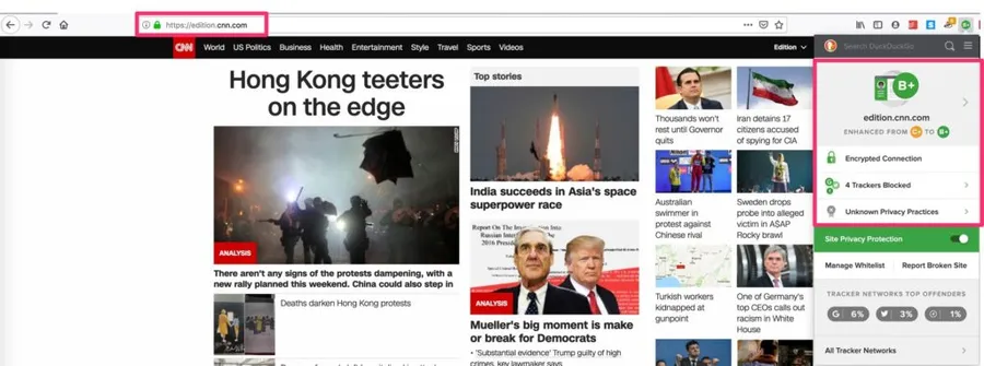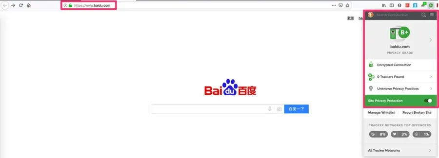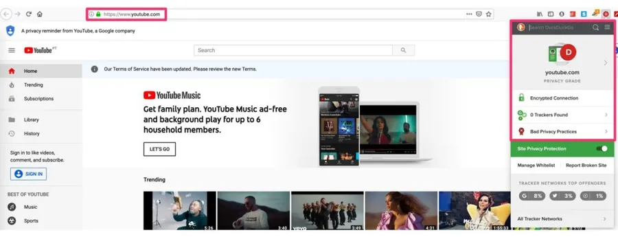 Duckduckgo’s Privacy Tool - this will give you some helpful information of the number of trackers on each page that you visit, blocks them, and provides you a simple overview of the level of privacy of each website. Here are some examples: