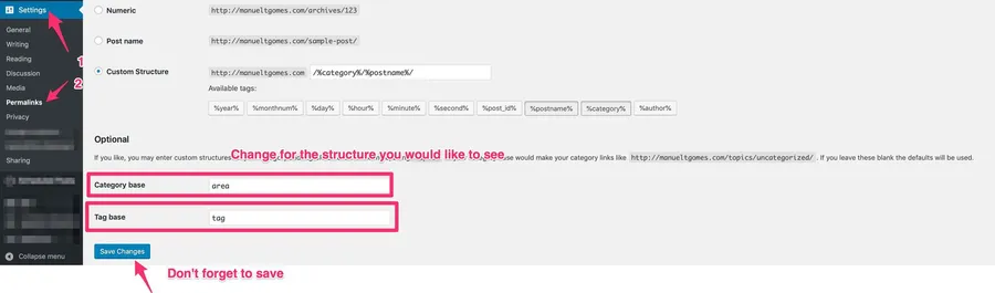 If we name the "Category" something like "Area," we want that same name to show up in the URL, like "www.manueltgomes.com/area/privacy," keeping the site's URL structure beautiful and consistent. You can apply the same strategy for tags if you use them.