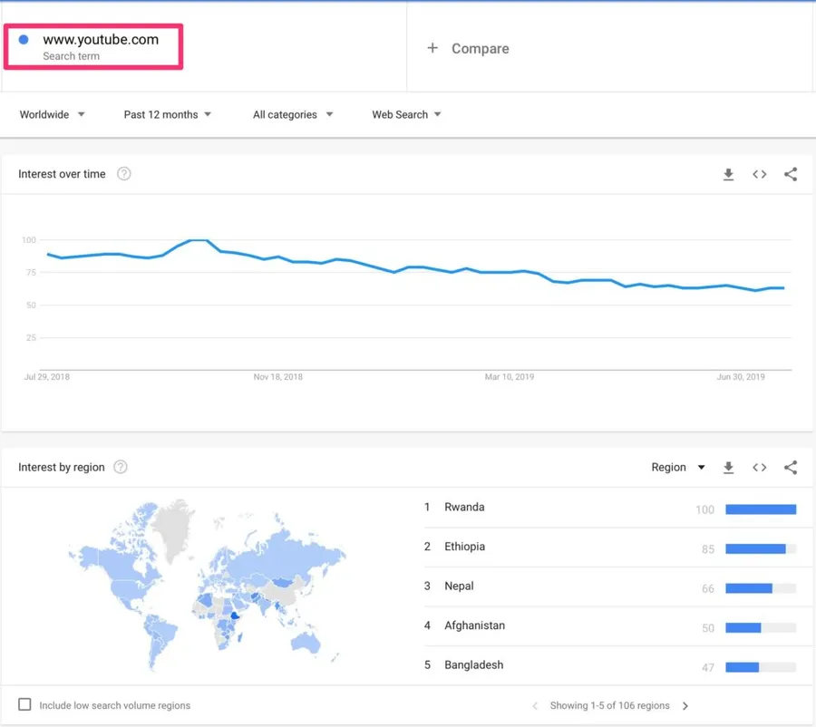 URLs are a fantastic paradox. People pay millions to have one, but they, more and more, sites are found through Google or other social networks. If you don’t believe me here are the trends for people that search Google for www.youtube.com: