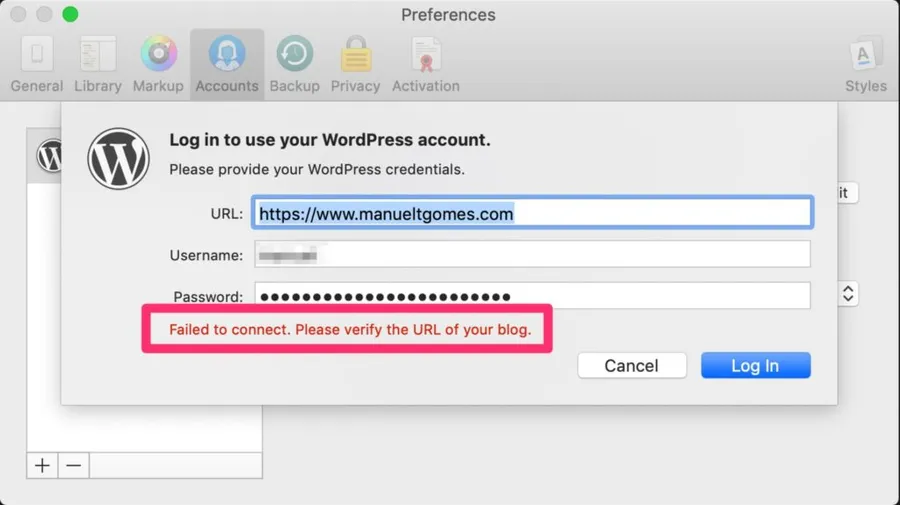 Failed to connect. Please verify the URL of your blog.