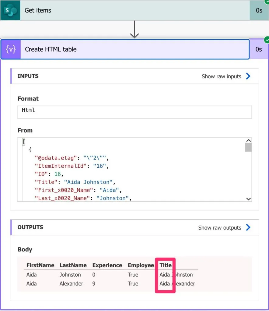 Here’s the test in Power Automate. We use a table to see the results quickly and check if our filter is working.