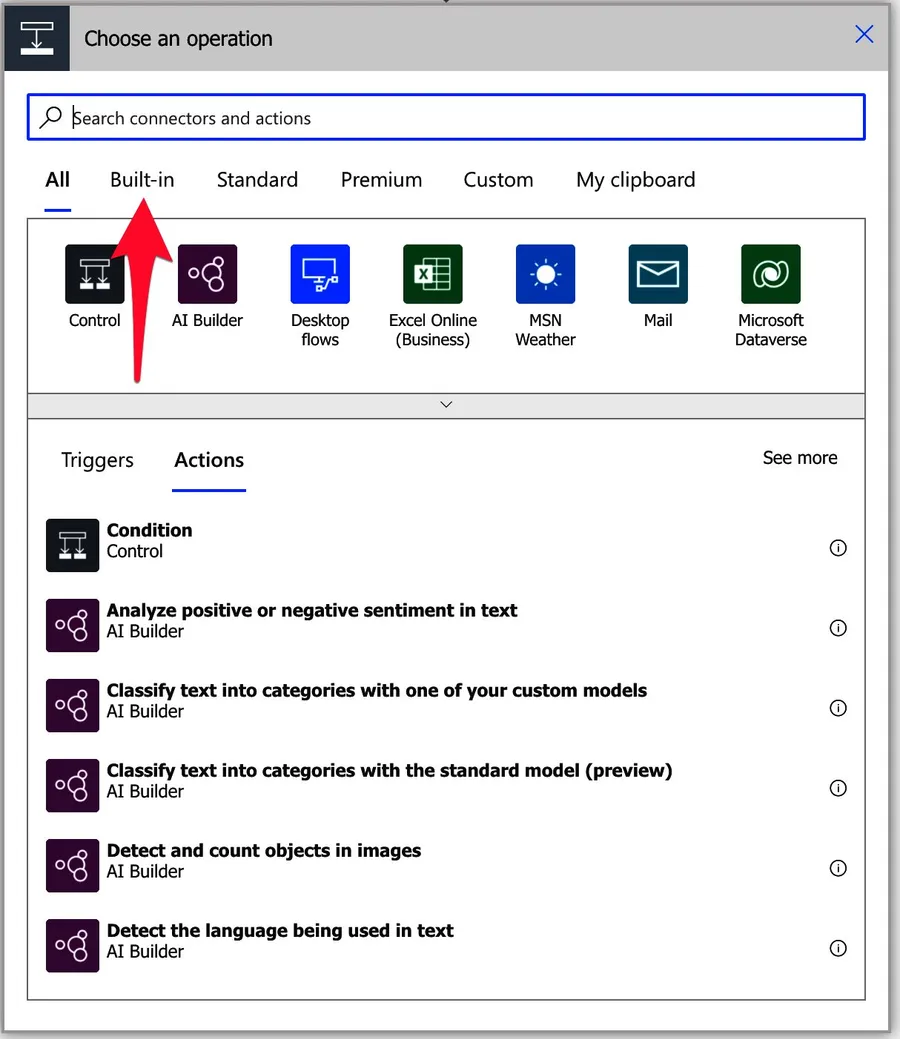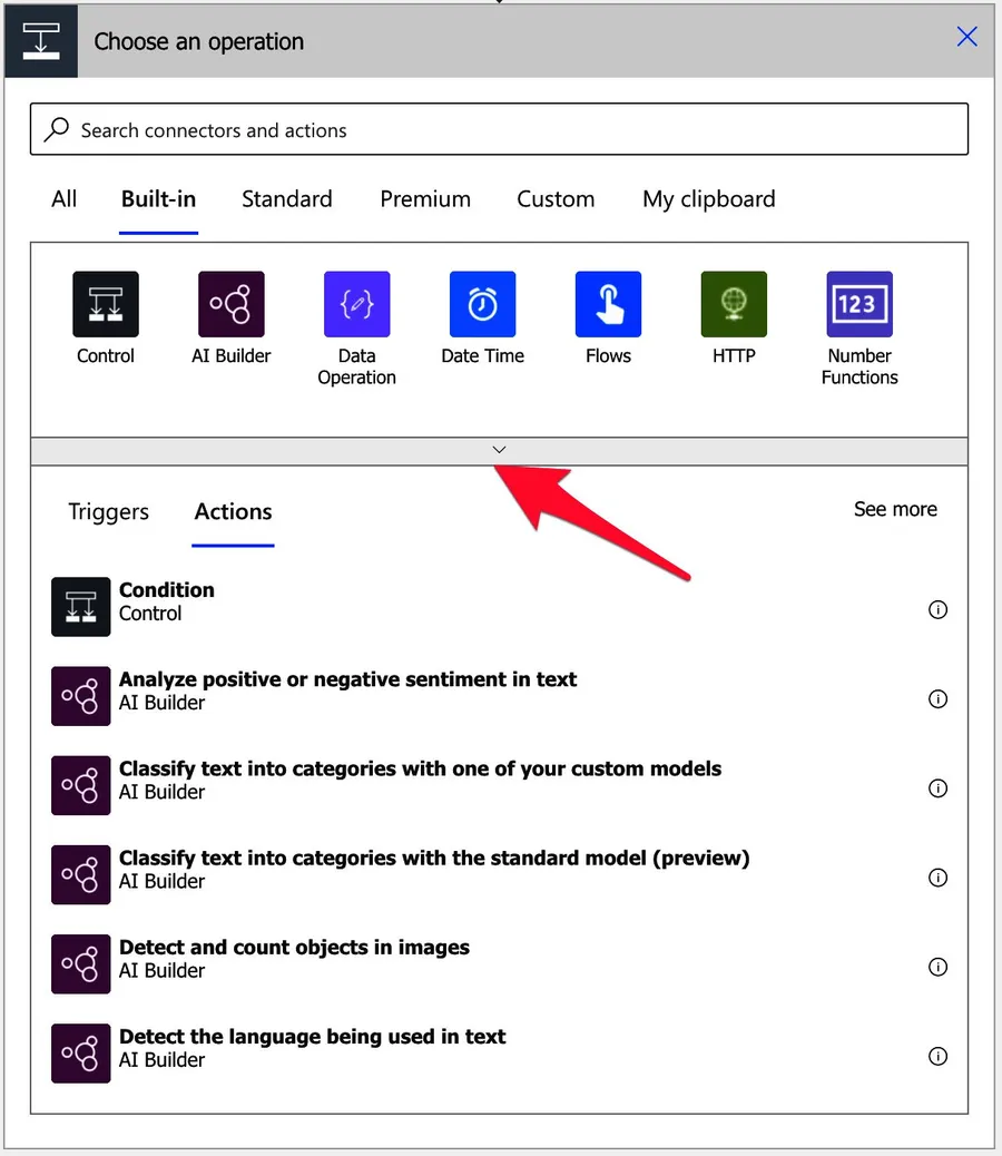 Power Automate tends to save the most common actions in the main screen, so check there before going through the complete hierarchy. Also, you can use the search to find it quickly. [/su_panel]