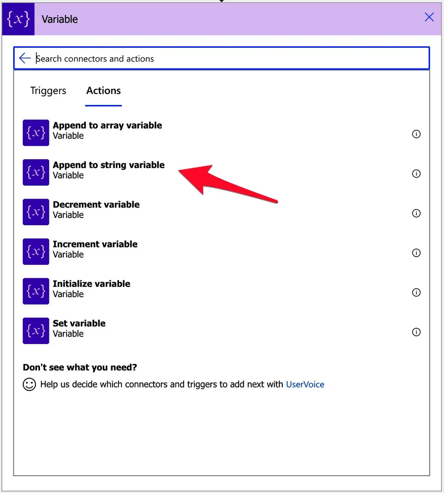 Select the “append to string variable” action.