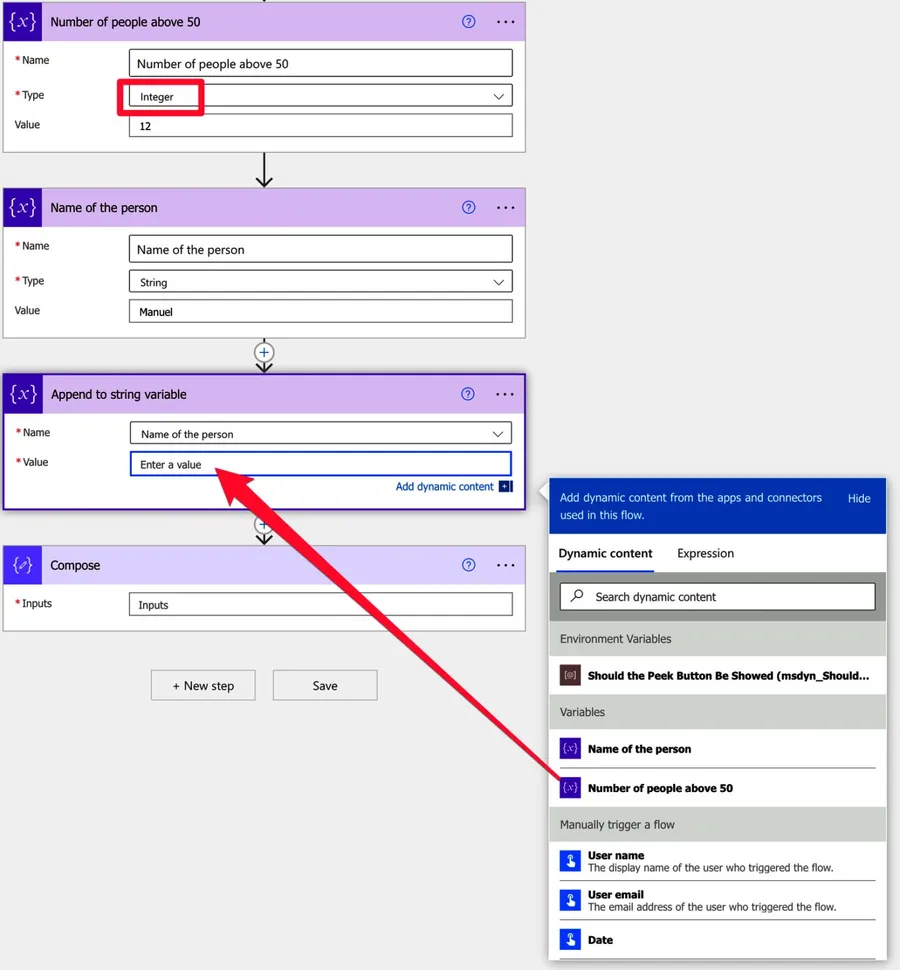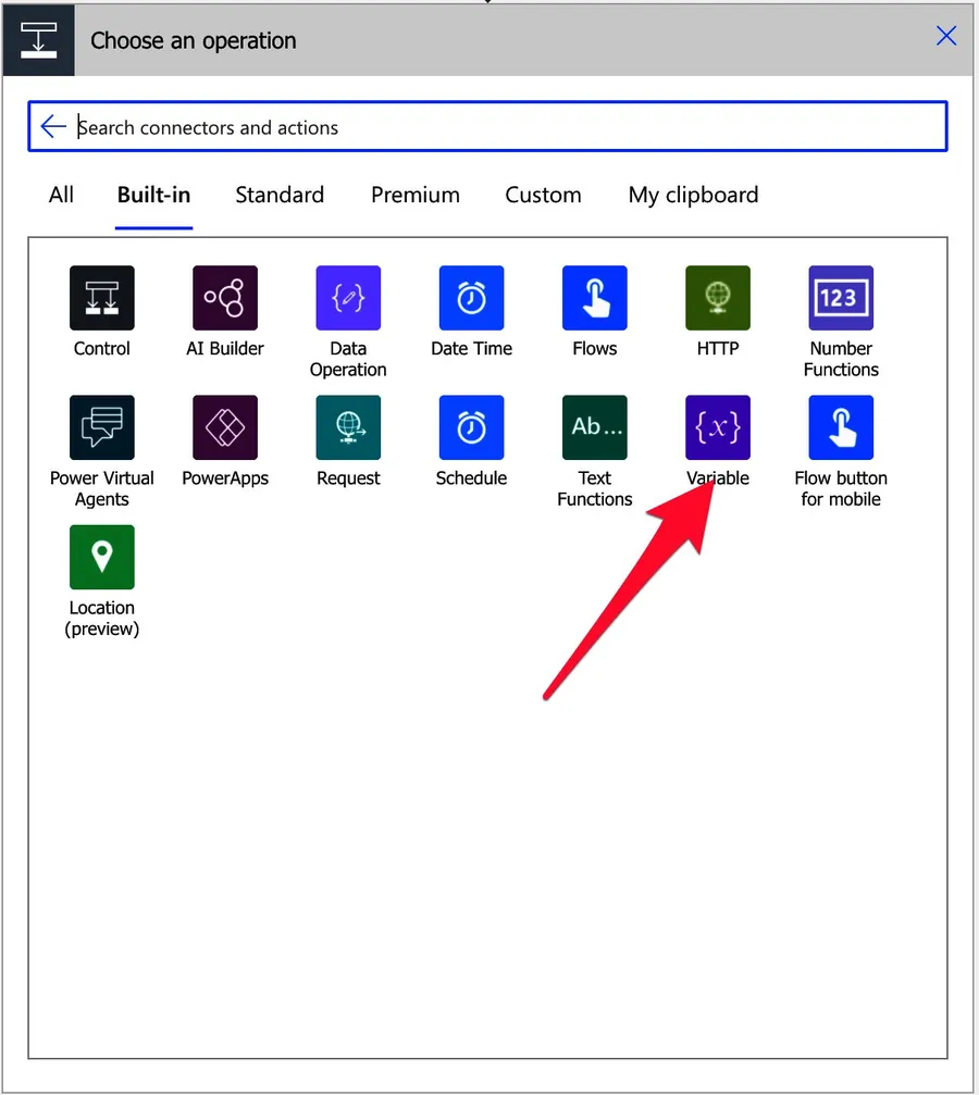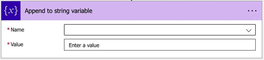 To use the “append to string variable” action, you first need to use the “Initialize variable” action to create a variable. After that, you’ll see it in the dropdown by the name you defined.