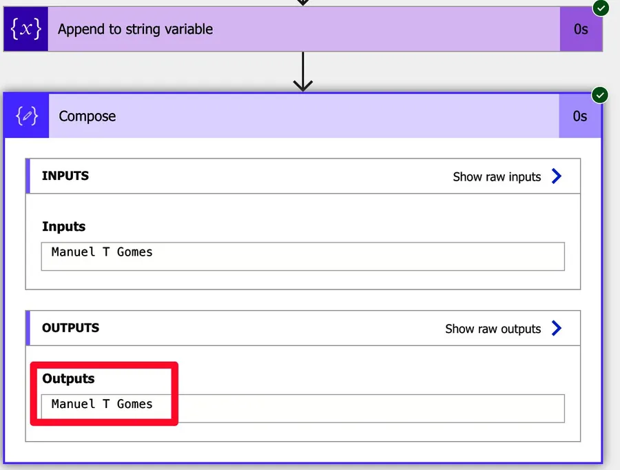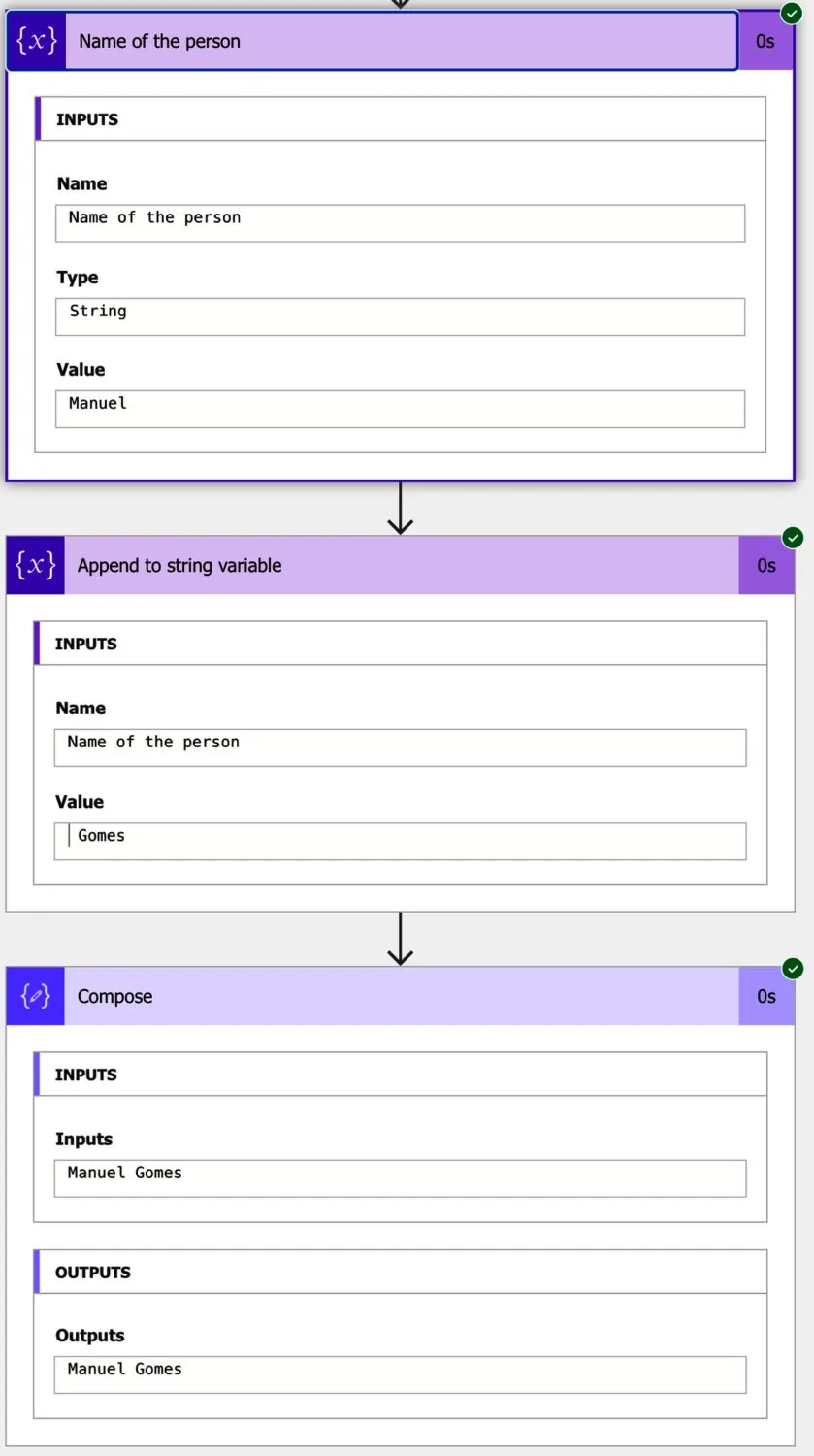 As we mentioned before, the “append to string variable” action is a specialized “set variable” action, where it combines it with the “Concat function.” So if we have the variable with “Manuel” and use the “append to a string variable,” the string “ Gomes.”