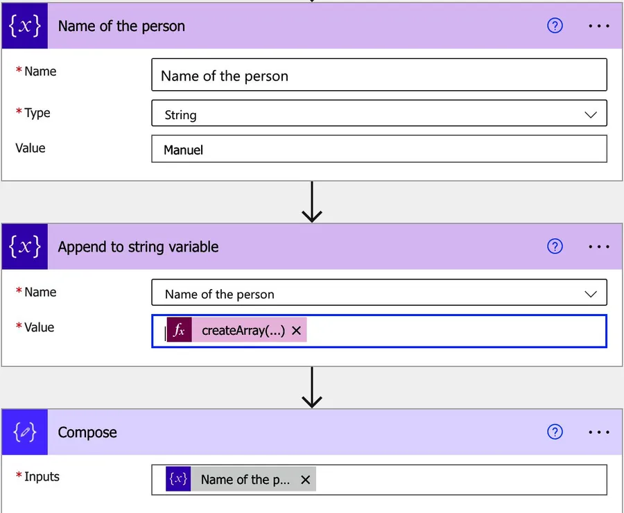 Nice that Power Automate converts the values automatically for us. But this doesn’t mean that the values are always converted correctly. Let’s look at an array, for example. We can use the “createArray” function to add to the “append to string variable” action and see what happens.