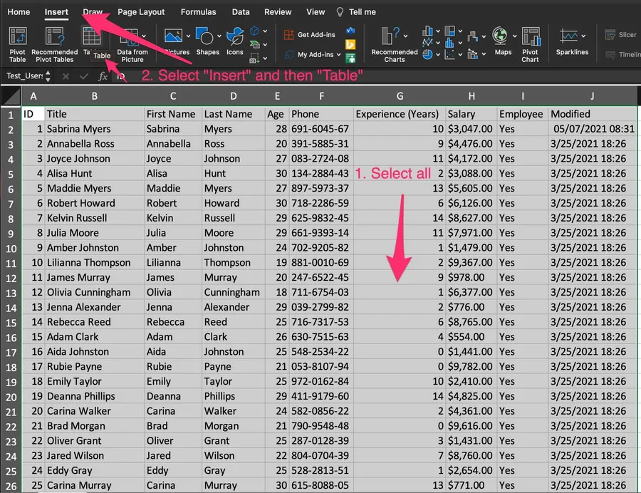 Here's how to do it. I'm using Excel for macOS, but it works the same way in the Windows version. So first, select the data.