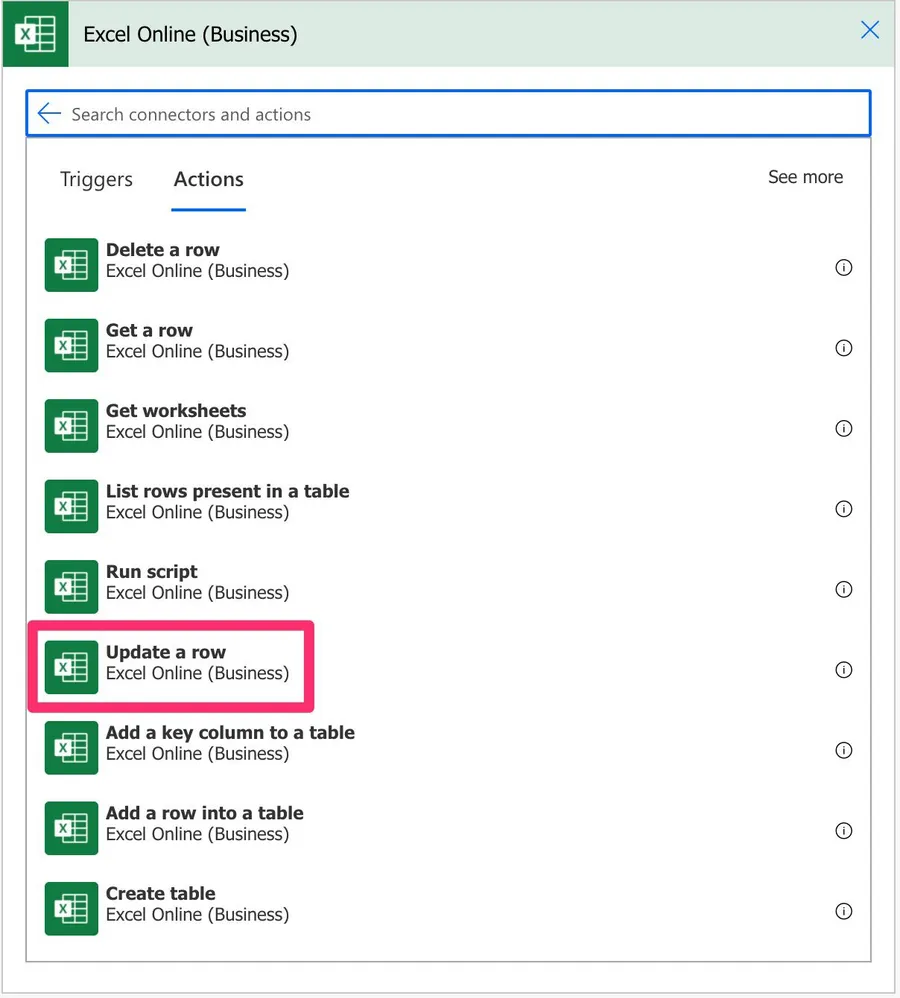 To find it you can search for “Excel update a row” action or by going to “Excel Online”.