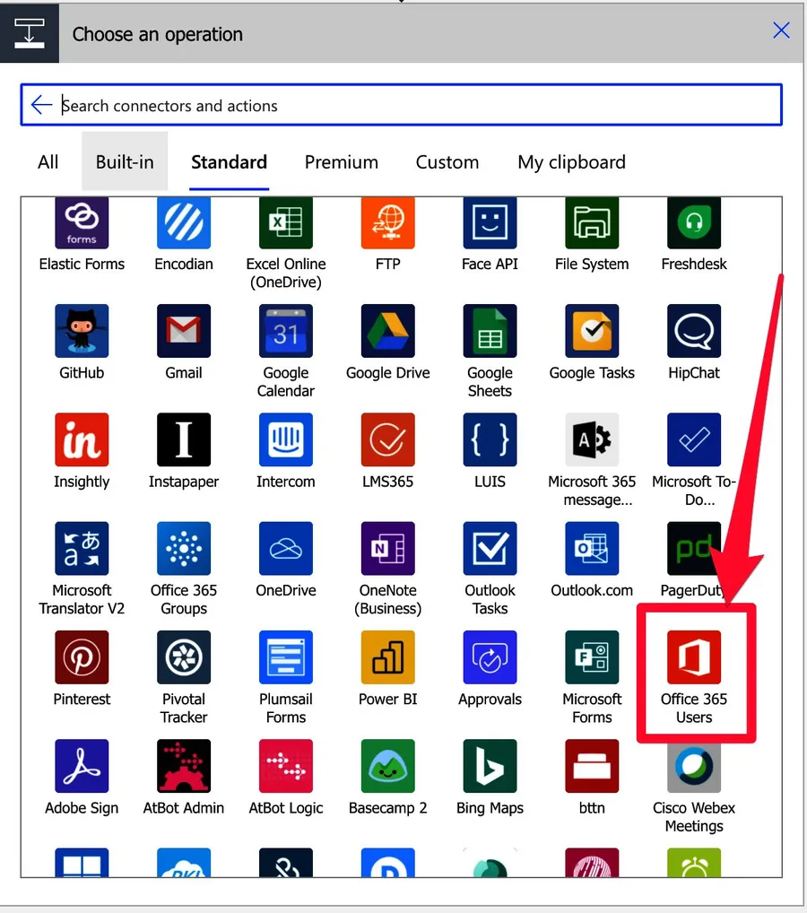 To find it, you can search for the "Get my profile" action or go to "Standard".