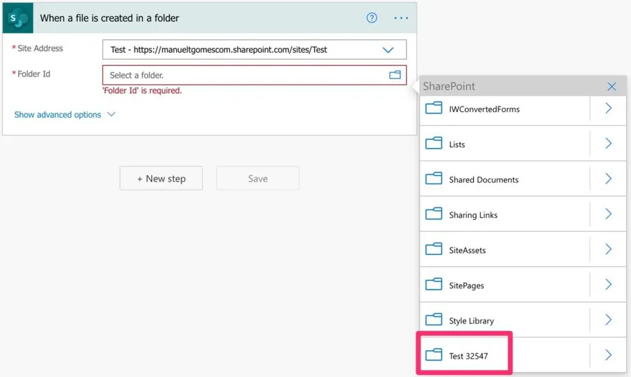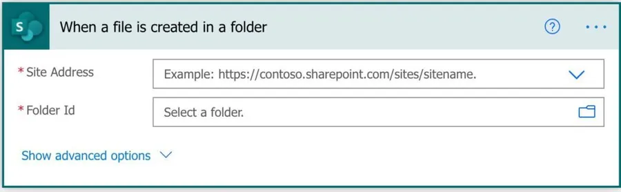 The SharePoint “when a file is created in a folder” trigger is quite simple. You only need to provide the site address and the folder you want to search.