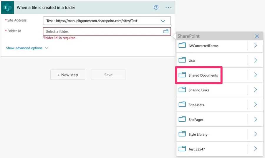 The “Shared Documents” is the default “Document Library” created when the SharePoint Site is created. But as you can see, there are many more folders to choose from. In addition, you can pick other “Document Library”: