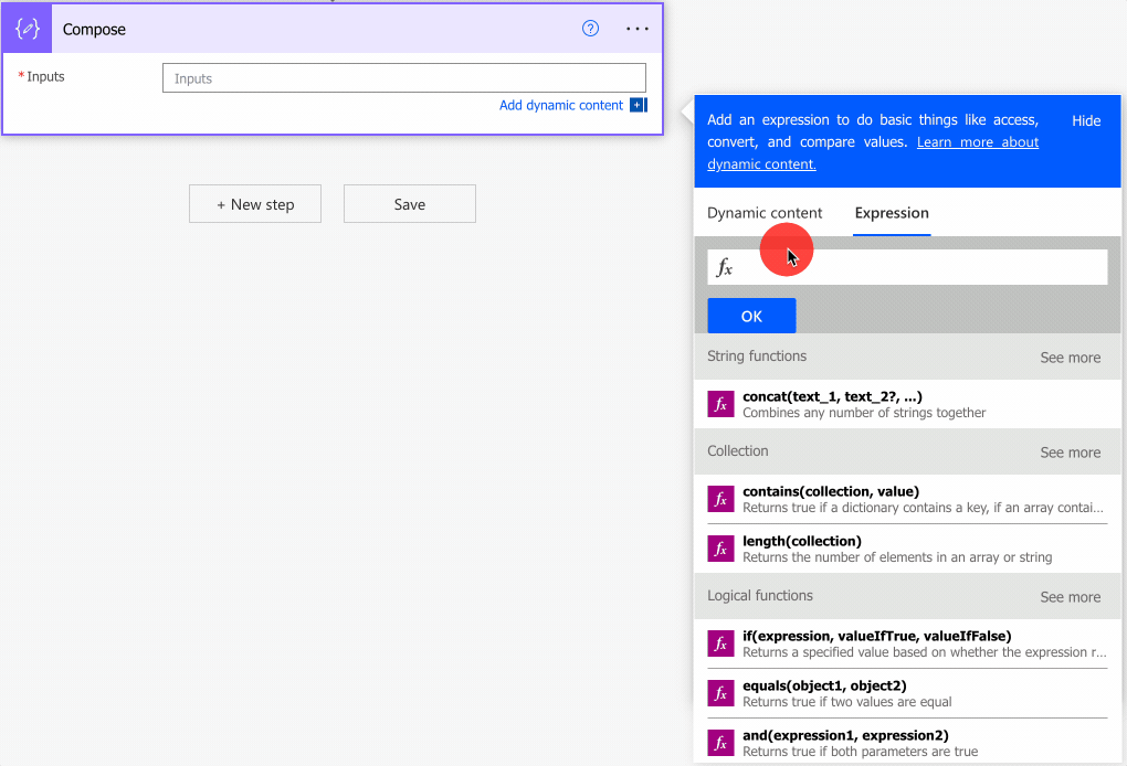 You can find the function in every action where a formula is supported. For example, let’s look at a “Compose” action: